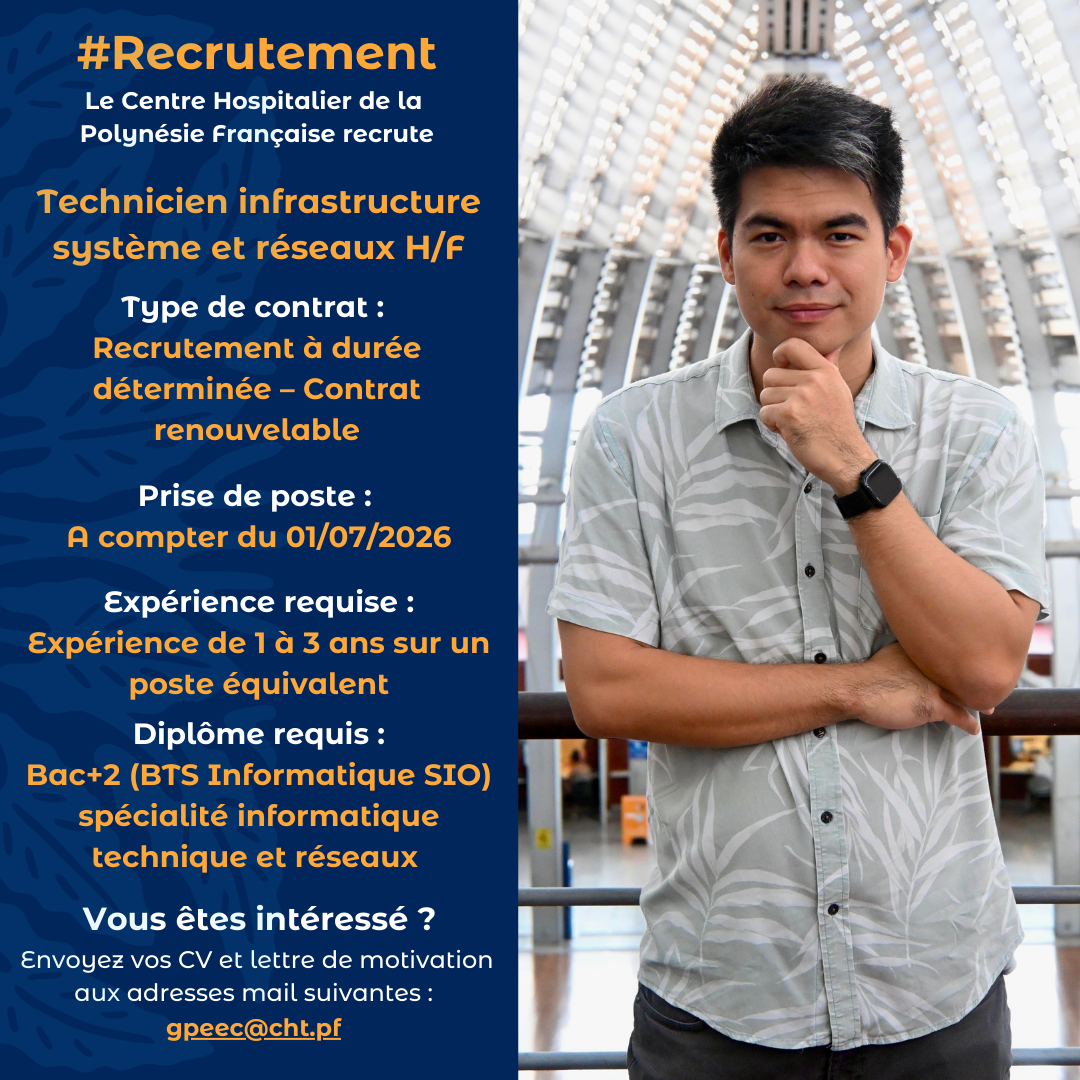 Le CHPF recrute un(e) Ingénieur(e) Qualité CONTRAT Contrat d’une durée déterminée, renouvelable Prise de poste à compter du 23/03/2026 CANDIDATURE Par mail : gpeec@cht.pf Consultez la fiche de poste ici...