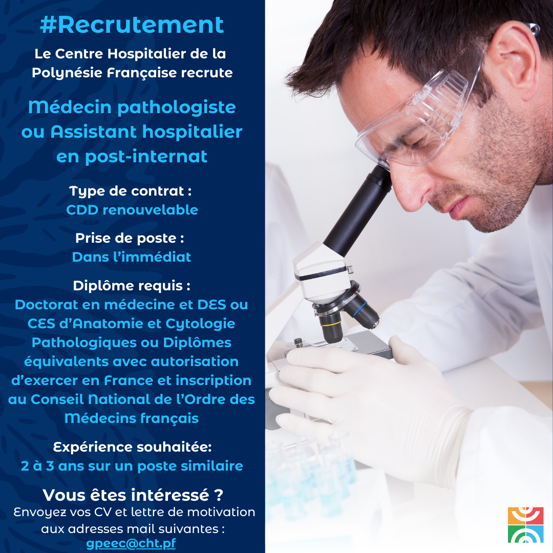 Le CHPF recrute un médecin pathologiste ou un assistant hospitalier en post-internat CONTRAT Contrat d’une durée déterminée, renouvelable Prise de poste dans l’immédiat CANDIDATURE Par mail : gpeec@cht.pf Consultez la fiche de poste ici