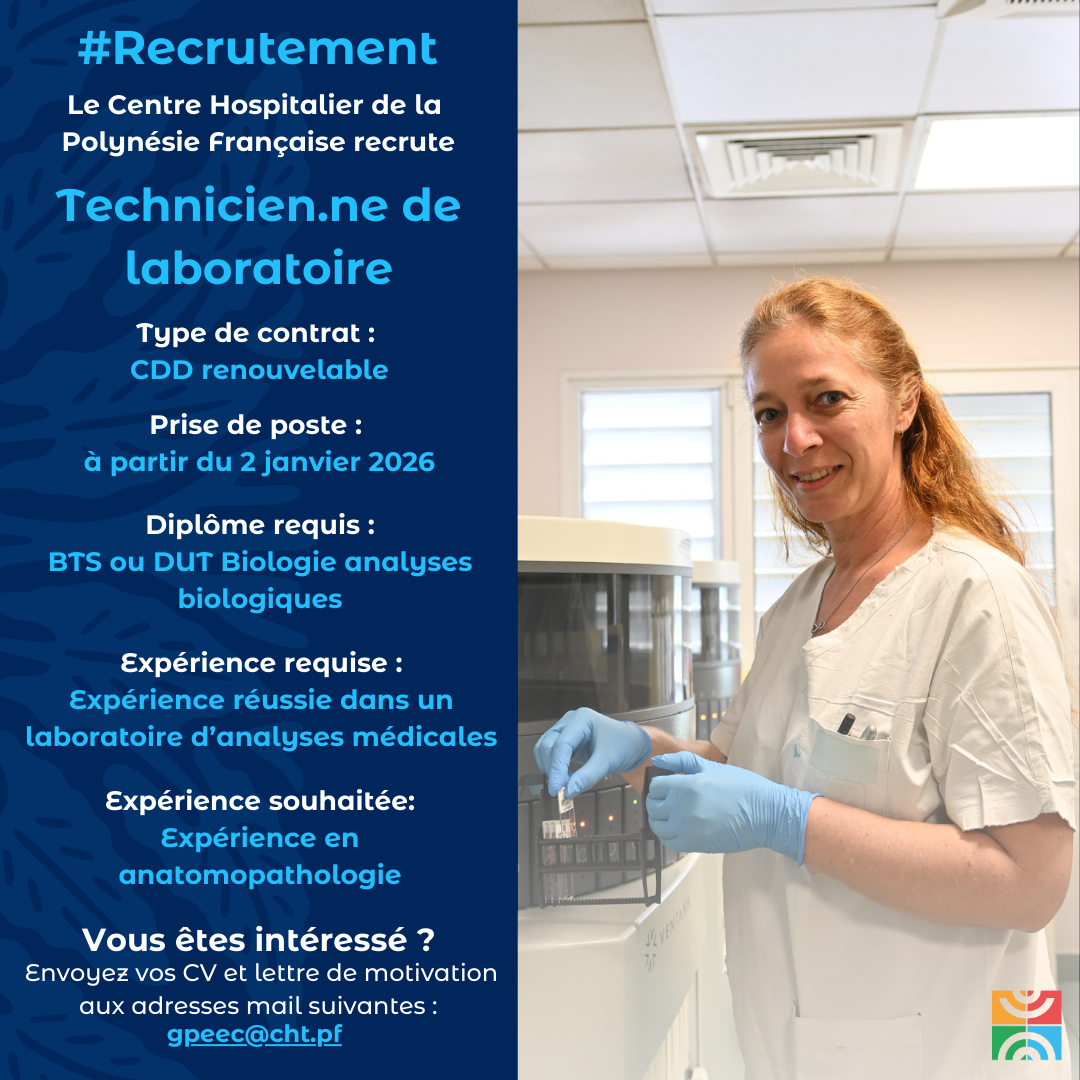 Le CHPF recrute un.e technicien.ne de laboratoire CONTRAT Contrat d’une durée déterminée, renouvelable Prise de poste à partir du 2 janvier 2026 CANDIDATURE Par mail : gpeec@cht.pf Consultez la fiche de poste ici